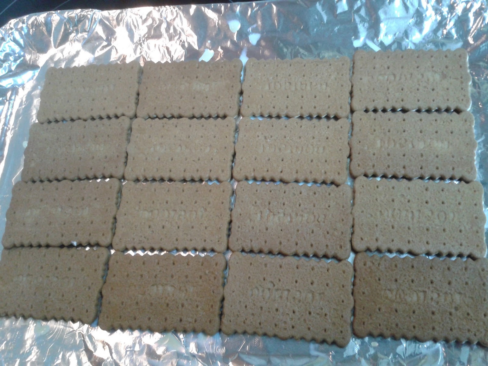 Lo metemos en el microondas 30 segundos y comprobamos si vemos que ya se puede aplastar lo sacamos y revolvemos bien, ya que con el mismo calor se termina de deshacer. Si vemos que está todavía duro meterlo pero de poco  en pocos segundos, para in comprobando. Ya que se quema muy fácil.Echamos ahora chocolate negro sobre las galletas  para napar la tarta.